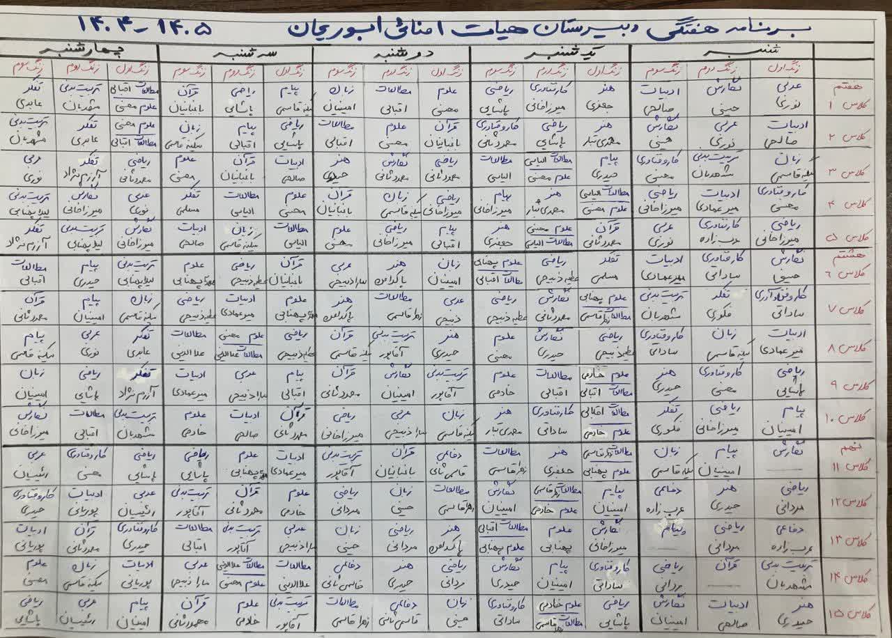 کلاس های فوق برنامه یکشنبه و سه شنبه ساعت 12 و نیم تا 1و 45 دقیقه در مودرسه بر گزار می گردد